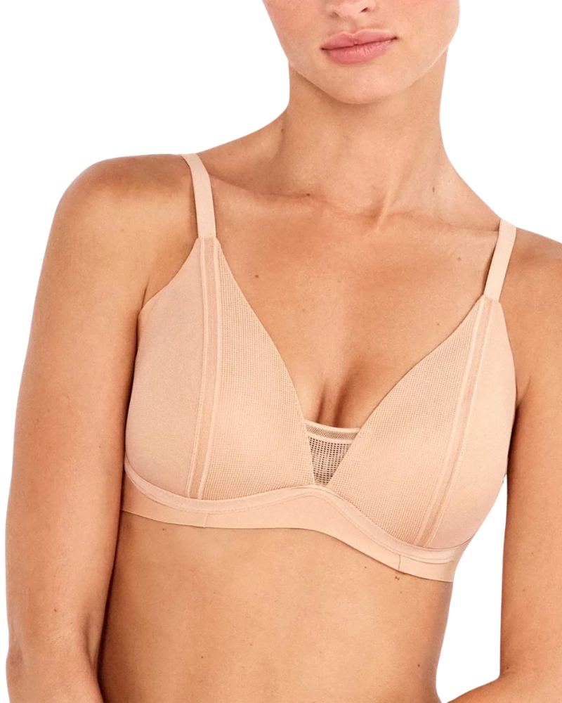 Dámská podprsenka má mírně vyztužené tvarované košíčky triangle střihu potaženy efektním tylem. Mezi košíčky je rovněž pro zajištění prsou trojúhelníček z tylu a po bocích je hladká látka, aby podržela prsa v podpaží.