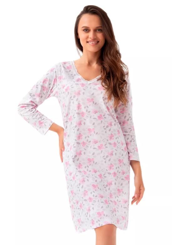 Dámská noční košile 261/51 značky LUNA přináší spojení elegance a pohodlí, které ocení každá žena. Lehký materiál z čisté bavlny jemně obepíná tělo a zajišťuje příjemný pocit po celou noc i během odpočinku doma. Decentní květinový vzor v pastelových tónech spolu s jemnou krajkou vytváří okouzlující vzhled, který působí svěže a žensky. Vzdušný střih s výstřihem do V podtrhuje ženskost, zatímco dlouhé rukávy poskytují optimální komfort při jakékoli teplotě.