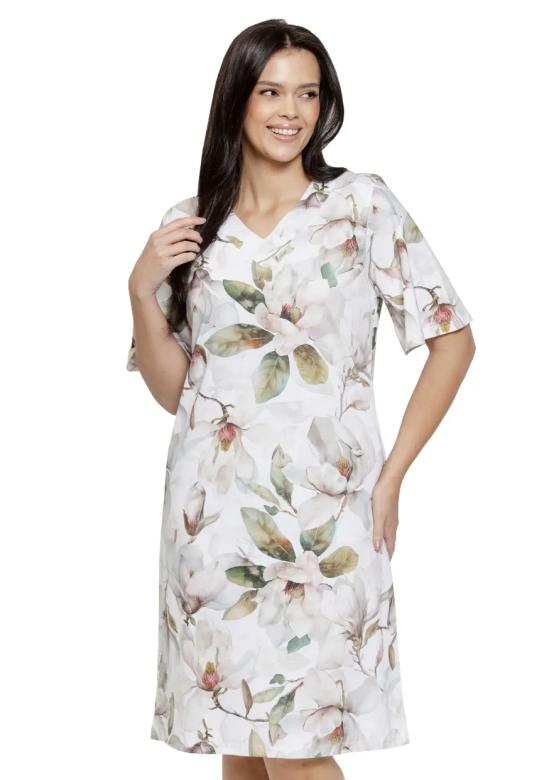 Dámská noční košile Afrodyta 3566 značky TARO představuje spojení elegance a pohodlí, které ocení každá žena hledající kvalitní spánek i stylový vzhled. Jemný květinový vzor na světlém podkladu působí svěže a žensky, zatímco volnější střih zajišťuje maximální komfort během celé noci. Lehký materiál příjemně dýchá a hladký povrch bavlny je šetrný k pokožce – ideální pro chvíle odpočinku i domácí relaxace. Véčkový výstřih decentně zvýrazňuje dekolt, krátké rukávy poskytují volnost pohybu v teplejších měsíc…