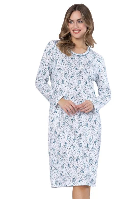 Dámská noční košile Beti 1641 značky LEVEZA přináší dokonalou harmonii pohodlí a stylu pro každou ženu, která si potrpí na kvalitní spánek i chvíle odpočinku doma. Tento model zaujme svým jemným botanickým vzorem v zelených tónech na světlém podkladu, který působí elegantně a navozuje pocit klidu. Příjemný materiál ze 100% bavlny zajišťuje měkkost a výbornou prodyšnost, takže se budete cítit svěže po celou noc. Dlouhé rukávy a kulatý výstřih s decentním kontrastním lemováním poskytují maximální pohodlí b…