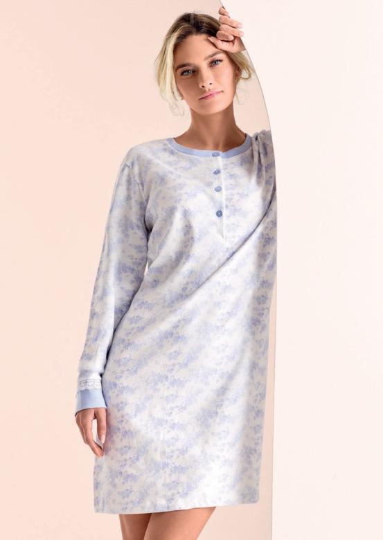 Dámská vzorovaná noční košile italské značky Infiore. Košile má dlouhý rukáv, který je ukončený úplety. Délka košile je nad kolena. Košile má légu na čtyři knoflíky. Košile je ušitá z velmi příjemné hřejivé bavlny.