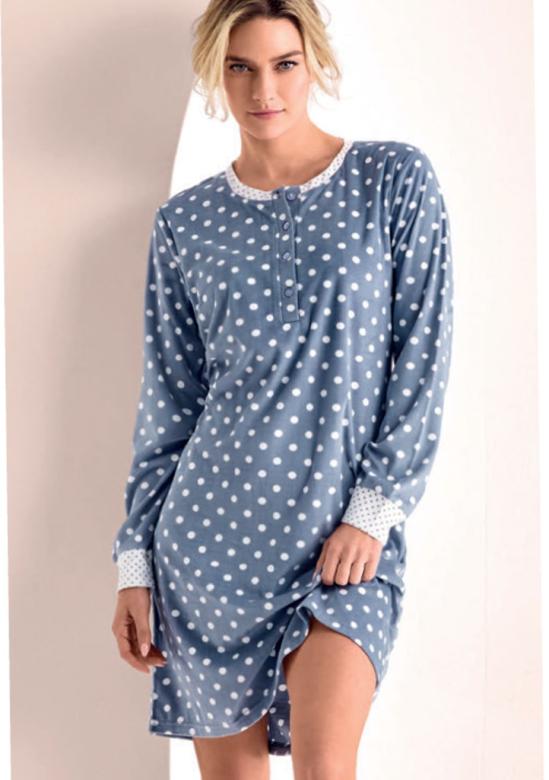 Dámská vzorovaná noční košile italské značky Infiore. Fleecová košile má dlouhý rukáv, který je ukončený úplety. Délka košile je nad kolena. Košile má légu na čtyři knoflíky. Košile je ušitá z velmi příjemného hřejivého materiálu.