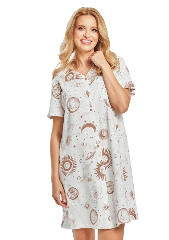 Dámská noční košile Sol 3521 značky TARO přináší spojení elegance a pohodlí, které oceníte při každém večeru i líném ránu. Její vzdušný střih s krátkými rukávy a klasickým límečkem vytváří příjemně uvolněnou siluetu, která Vás nebude omezovat v pohybu. Světlý podklad doplňuje hravý motiv slunce, měsíce a hvězd v teplých zemitých tónech – tento originální vzor vnese do Vašeho domova pocit klidu i radosti.