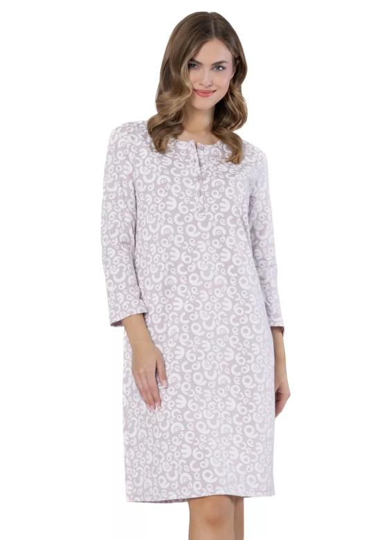 Dámská noční košile Zuza 1616 značky LEVEZA přináší dokonalou kombinaci pohodlí a elegance pro každodenní relaxaci. Její jemný pastelový odstín spolu s decentním vzorem vytváří příjemnou atmosféru k odpočinku. Díky volnému střihu a tříčtvrtečním rukávům si užijete maximální komfort při spánku i domácím lenošení. kulatý výstřih s knoflíkovou légou dodává modelu nádech sofistikovanosti, zatímco rovný lem podtrhuje čistý vzhled.