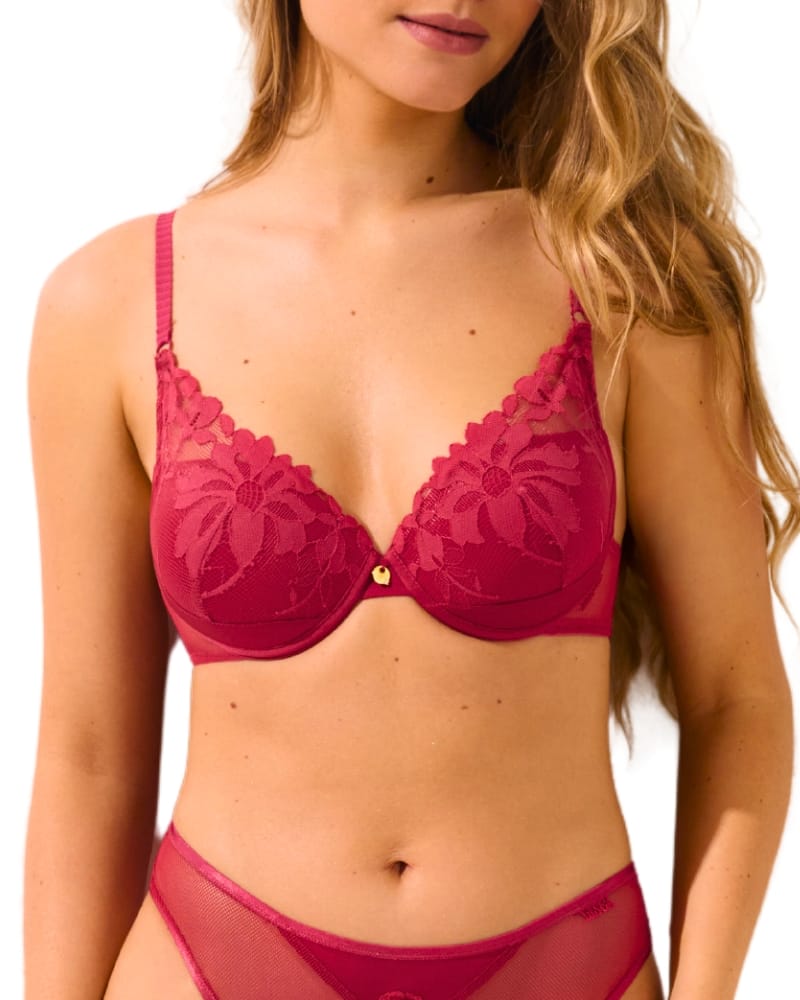 Podprsenka má košíčky potaženy květinovou krajkou v kombinaci s hladkým saténem, který přechází i do obvodu.