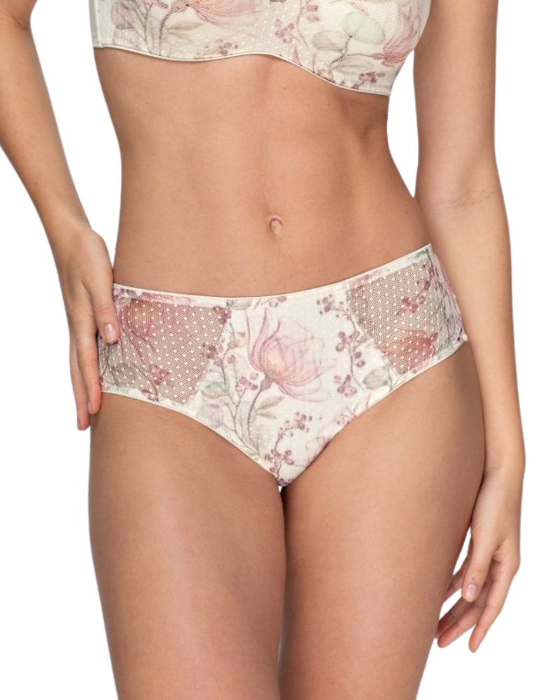 Nádherný květinový tyl v přední části s jemnými barvami je vzadu kombinován s hladkým bezešvým materiálem střihu brazilek.