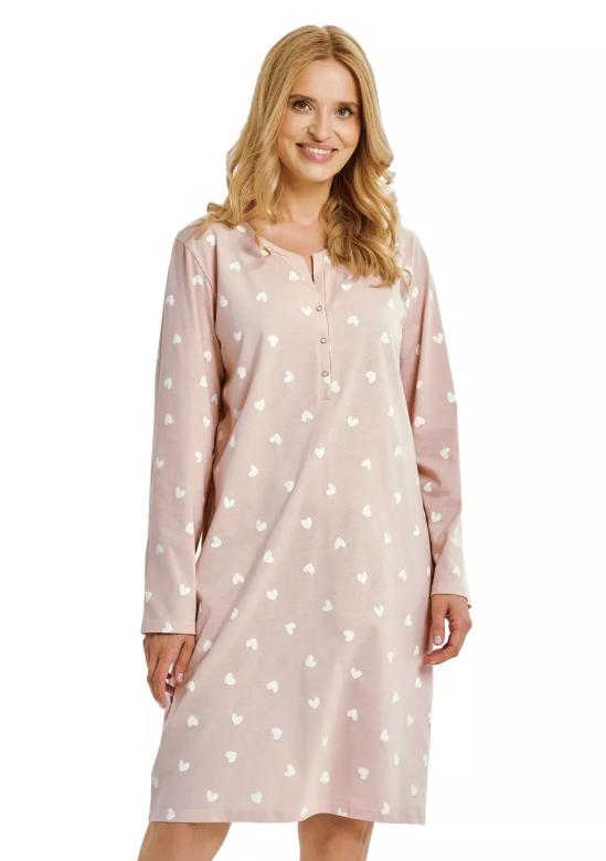dámské noční košile Nori 3443 značky TARO přináší do Vašeho večerního rituálu lehkost a pohodlí, které si zasloužíte. Jemný pastelově růžový odstín s hravým vzorem drobných bílých srdcí působí elegantně a zároveň útulně. střih je volný, sahající ke kolenům, což umožňuje volnost pohybu i maximální komfort při spánku nebo odpočinku doma. Dlouhé rukávy zakončené manžetami spolu s véčkovým výstřihem na knoflíky podtrhují rafinovanou jednoduchost tohoto kousku. Materiál tvoří kvalitní 100% bavlna, která je př…
