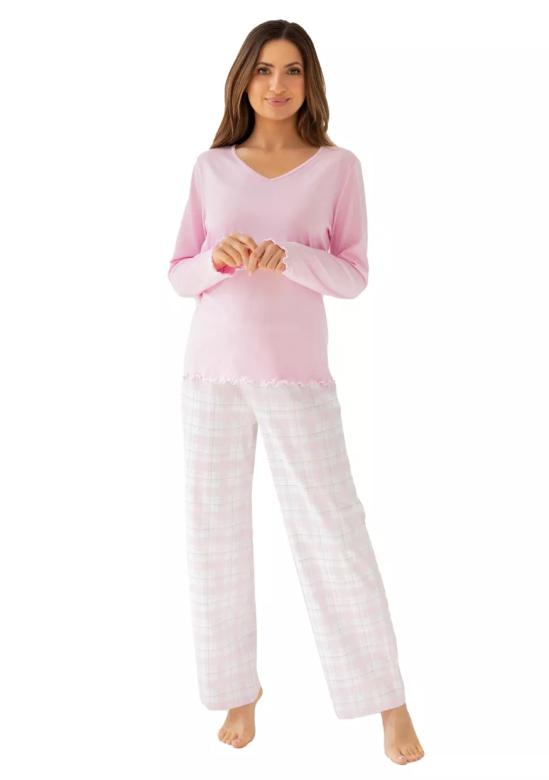 dámské pyžamo 712/51 značky REGINA představuje dokonalou volbu pro ženy, které hledají spojení elegance a pohodlí v domácím prostředí. Horní díl v jemné růžové barvě s dlouhými rukávy a véčkovým výstřihem působí lehce a žensky, zatímco decentní řasení na lemu dodává celku sofistikovaný nádech. Spodní část tvoří bílé kalhoty s jemným kostkovaným vzorem v pastelových tónech, které jsou volného střihu a díky elastickému pasu zajišťují maximální komfort při nošení i pohybu. Měkký materiál ze 100% bavlny je p…