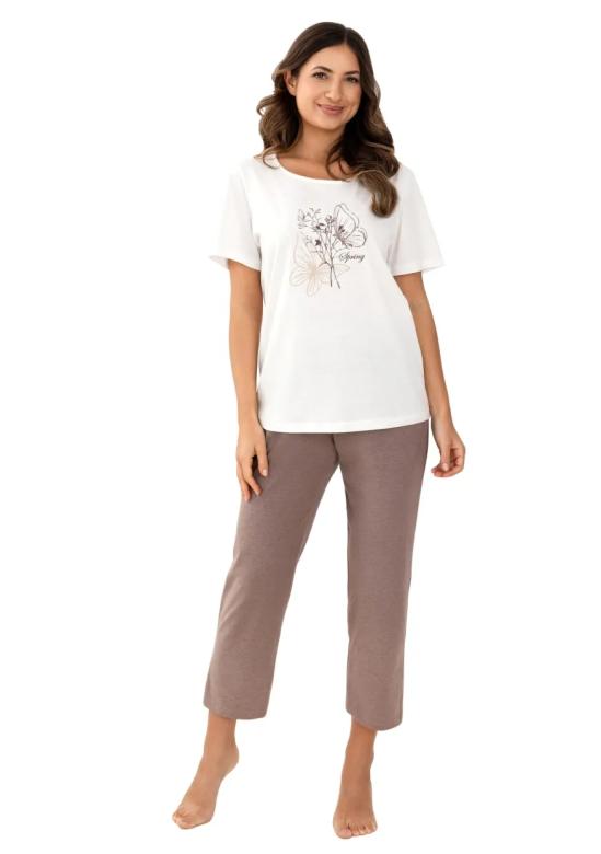 dámské pyžamo 739/62 značky REGINA představuje spojení elegance a pohodlí, které ocení každá žena toužící po kvalitním odpočinku. Horní díl v bílé barvě zdobí jemný květinový motiv, jenž dodává celku sofistikovaný vzhled. Díky volnému střihu s kulatým výstřihem a krátkými rukávy si užijete maximální komfort při každém pohybu. Spodní díl v decentním hnědém odstínu je navržen jako dlouhé kalhoty se střihem pro pocit lehkosti i během klidných domácích večerů.