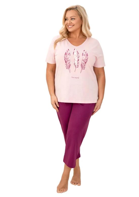 Dámské pyžamo 742/63 značky REGINA přináší spojení pohodlí a elegance do každodenního odpočinku. Vrchní díl v jemném pastelově růžovém odstínu zdobí umělecký potisk tří stylizovaných peříček, které dodávají outfitu osobitý šmrnc. Výstřih véčkového střihu působí vzdušně a lichotivě, zatímco krátké rukávy zajišťují volnost pohybu i příjemný pocit během celého dne.