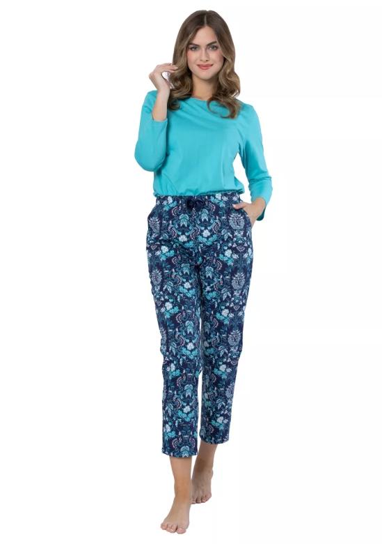 dámské pyžamo Aja 1652 značky LEVEZA představuje dokonalou kombinaci elegance a pohodlí pro každou ženu, která si potrpí na kvalitní domácí oděv. Vrchní díl v osvěžující tyrkysové barvě s dlouhými rukávy působí svěže a zároveň decentně. Volnější střih zajišťuje maximální komfort při nošení, zatímco kulatý výstřih podtrhuje ženskou siluetu. Spodní díl vyniká výrazným květinovým vzorem v tónech modré, fialové a zelené – tento kontrast dodává celému kompletu hravost i šmrnc.