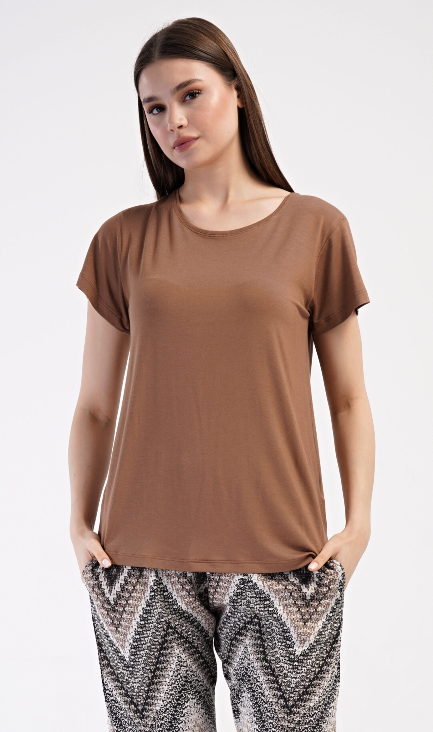 dámské pyžamo s krátkým rukávem Julie. Dámské pyžamo se skládá z trika s krátkým rukávem a dlouhých kalhot. triko je jednobarevné, bez potisku, má kulatý výstřih. kalhoty potištěné geometrickým vzorem mají v pase gumu a šňůrku na stažení, nemají kapsy. Použitý viskózový materiál je poddajný a příjemný na dotek.