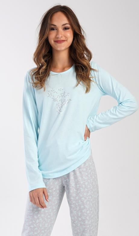 Pyžamo je v jemném modrém odstínu s lístečky, kalhoty dlouhé rovněž s motivy.