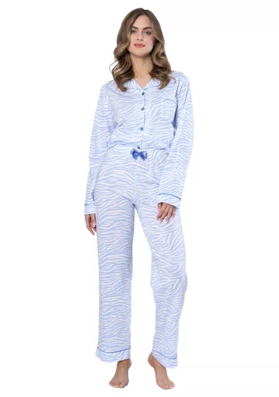 dámské pyžamo Dominika 1655 značky LEVEZA přináší spojení pohodlí a elegance, které oceníte při každém večeru i volných domácích chvílích. Měkký materiál ze 100% bavlny Vás pohladí svou lehkostí a zajistí příjemný pocit na pokožce po celou noc. Pyžamo je tvořeno propínací košilí s véčkovým výstřihem a dlouhými rukávy, které spolu s kalhotami vynikají jemným vzorovaným designem v modrých tónech. Elastický pas kalhot doplňuje decentní mašlička pro ženský detail i maximální komfort během nošení.