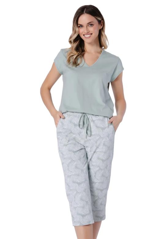dámské pyžamo Eleonora 1727 značky LEVEZA je ideální volbou pro ženy, které hledají spojení elegance a pohodlí. Horní díl s krátkým rukávem a véčkovým výstřihem působí jemně a lichotivě, zatímco měkký materiál v decentní zelené barvě přináší pocit svěžesti i během teplých nocí. Spodní část tvoří capri kalhoty, jejichž volný střih s elastickým pasem na šňůrku zaručuje maximální komfort při nošení. Světlý odstín kalhot doplňuje nenápadný vzor, který dodává celému kompletu stylový vzhled bez zbytečné okázal…
