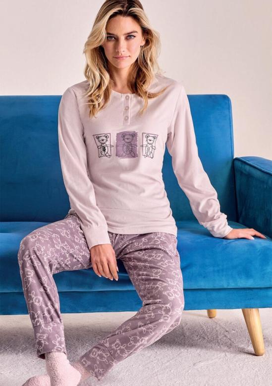 dámské fleecové pyžamo italské značky Infiore. Pyžamo je ze 100% polyesteru, je velmi příjemé a pohodlné. Vrchní díl má kulatý výstřih a légu se třemi knoflíky. Rukávy a spodní díl jsou ukončené úplety. Na přední straně je natištěná aplikace. Vzorované kalhoty jsou do pružné pohodlné gumy.