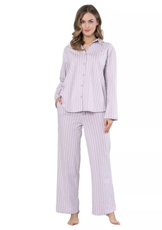 dámské pyžamo Judyta 1613 značky LEVEZA přináší elegantní spojení pohodlí a stylu pro každou ženu, která si potrpí na kvalitní domácí oblečení. Lehký materiál z čisté bavlny hladí pokožku a umožňuje volný pohyb během spánku i odpočinku. Díky jemnému proužkovanému vzoru v decentních odstínech fialové a bílé působí tento komplet svěže a moderně. Propínací horní díl s límečkem, dlouhými rukávy podtrhuje klasický vzhled, zatímco široké dlouhé kalhoty zajišťují maximální komfort po celý večer i noc.