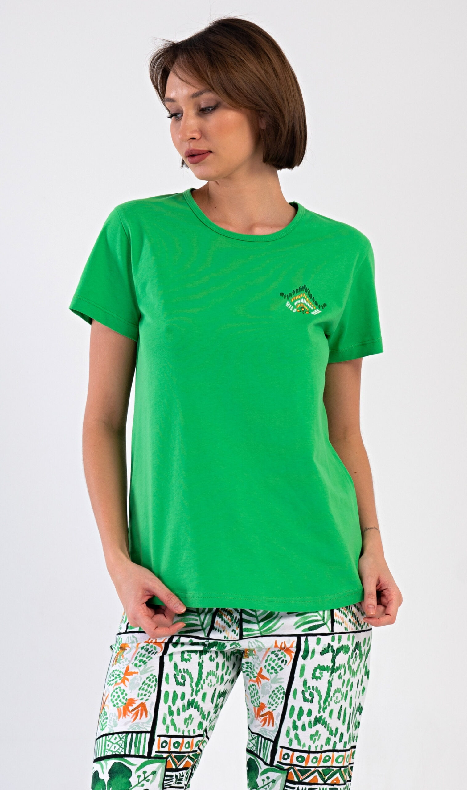 Pyžamo či domácí komplet má triko s krátkými rukávy a motivem a kalhoty do gumy.
