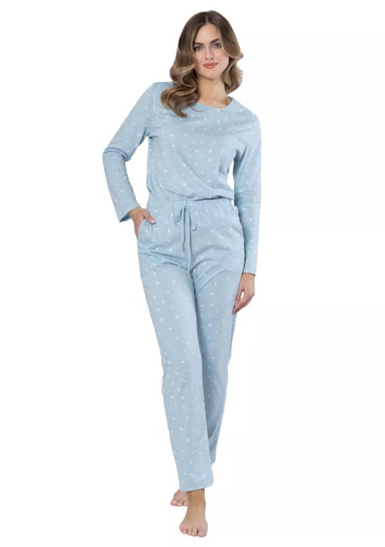 dámské pyžamo Marta 1646 značky LEVEZA přináší dokonalou rovnováhu mezi elegancí a pohodlím. Jemný světle modrý odstín s decentním vzorem dodává celému setu svěží, uvolněný vzhled, který oceníte při každém večerním odpočinku. Vrchní díl s dlouhými rukávy a kulatým výstřihem poskytuje příjemné zakrytí i volnost pohybu díky pohodlnému střihu. Spodní kalhoty jsou navrženy s elastickým pasem a šňůrkou pro individuální nastavení komfortu – ideální pro klidné noci i lenošení během dne.