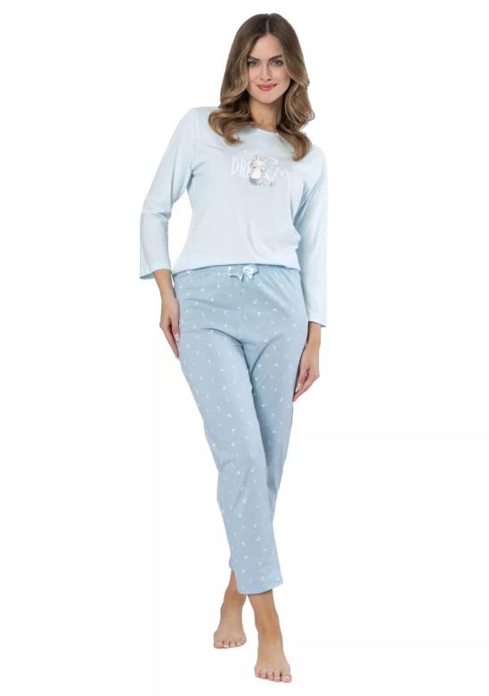 dámské pyžamo Michalina 1645 značky LEVEZA přináší spojení elegance a pohodlí, které si zamilujete při každém večeru i víkendovém lenošení. Jemný světle modrý odstín působí svěže a příjemně. Horní díl zdobí hravý motiv s nápisem „Dream“, což vytváří radostnou atmosféru pro klidné chvíle doma. Tříčtvrteční rukávy a kulatý výstřih podporují pocit volnosti.