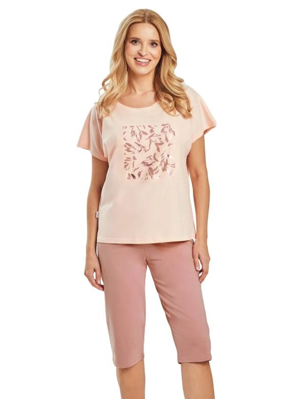 dámské pyžamo Valentine 3523 značky TARO představuje dokonalou kombinaci elegance a pohodlí, kterou si zamilujete během každého večera. Horní díl s volnějším střihem a krátkými rukávy vytváří vzdušný pocit lehkosti, zatímco jemná pastelově růžová barva působí příjemně a uklidňujícím dojmem. Přední část zdobí decentní květinový motiv v tmavším odstínu růžové, který podtrhuje ženskost celého modelu. Spodní díl tvoří pohodlné capri kalhoty ve stejném tónu – ideální délka i střih umožňují volnost pohybu při …