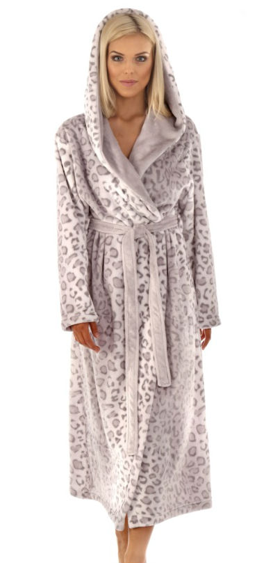 Dámský župan má dvojitou kapuci a kapsy v bočním švu.
