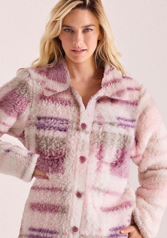 Dámský župan Infiore z ultra hebkého a nadýchaného materiálu nabízí výjimečné teplo i maximální pohodlí. Má moderní střih na knoflíky, vyšší límec a hravý vzor v odstínech růžové, fialové a smetanové, který působí jemně a zároveň stylově. Materiál je měkký, příjemný na dotek a ideální pro chladné dny i domácí relax. Skvělá volba pro všechny, kdo hledají spojení hřejivosti, komfortu a elegantního vzhledu.